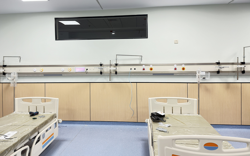 山东鲁南医院东区新安装中心供氧系统和负压吸引系统,在一层设有独立的中心供氧站和负压吸引泵组,病房每个床位设立液晶显示信息化呼叫器、阅读灯、电源插座、吸引和氧气德标DIN终端接口。