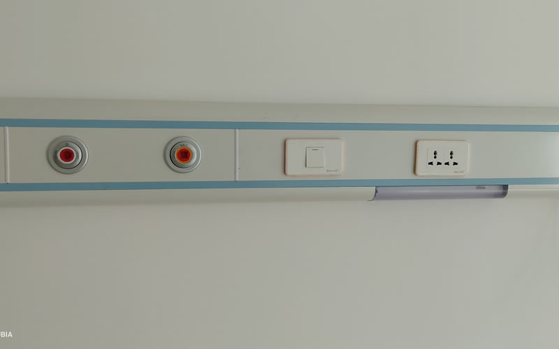 病房床头选用优质铝合金防静电设备带,中心供氧终端选用较为高档的德标制式氧气终端,以及德标真空负压吸引终端。普通病房每个床位配置一个氧气终端、一个吸引终端、一个六孔电源插座、一个LED阅读灯、一个呼叫对讲系统分机。