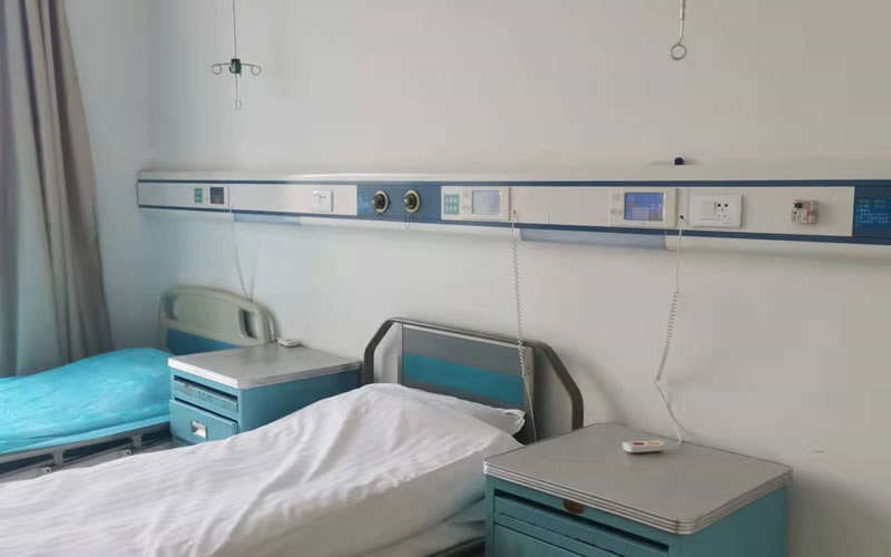 每间病房分别设立2-3张床位,每个床位安装中心供氧系统氧气终端、中心负压吸引系统吸引终端、呼叫对讲系统分机、开关插座和床头照明。