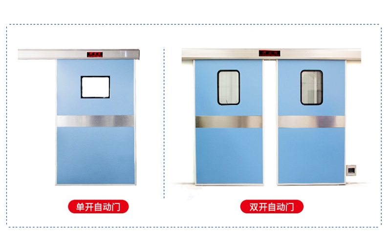 5. 美观性 门机盖板附带高亮LED"手术中"指示灯,门扇开设双层钢化玻璃透视窗