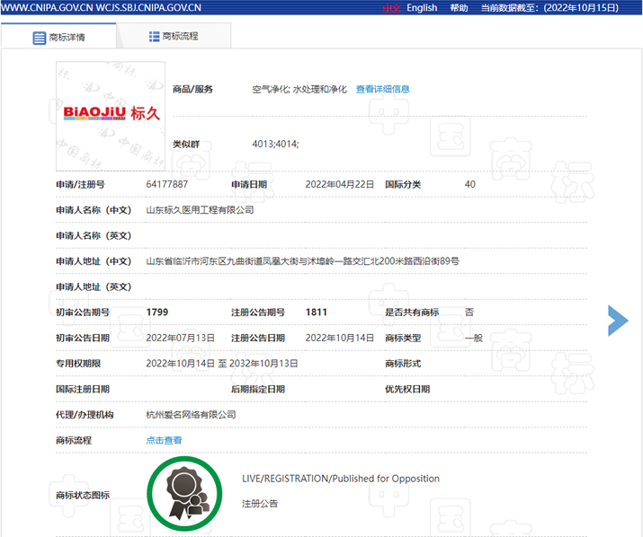 经国家商标总局sbj.cnipa.gov.cn网站查询获悉,我公司申请注册的标久品牌注册商标获得批准。