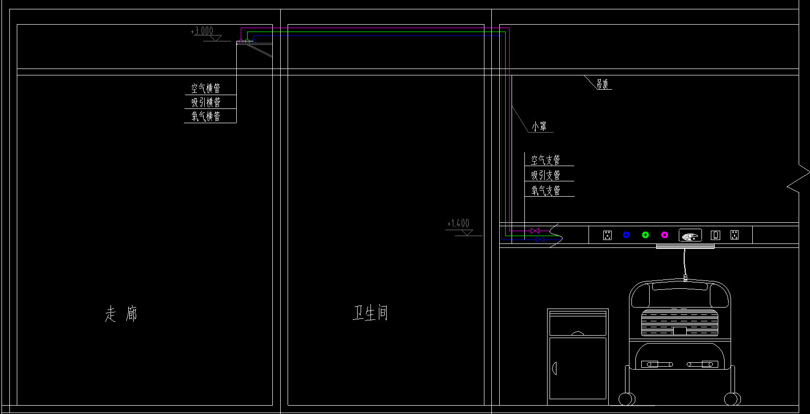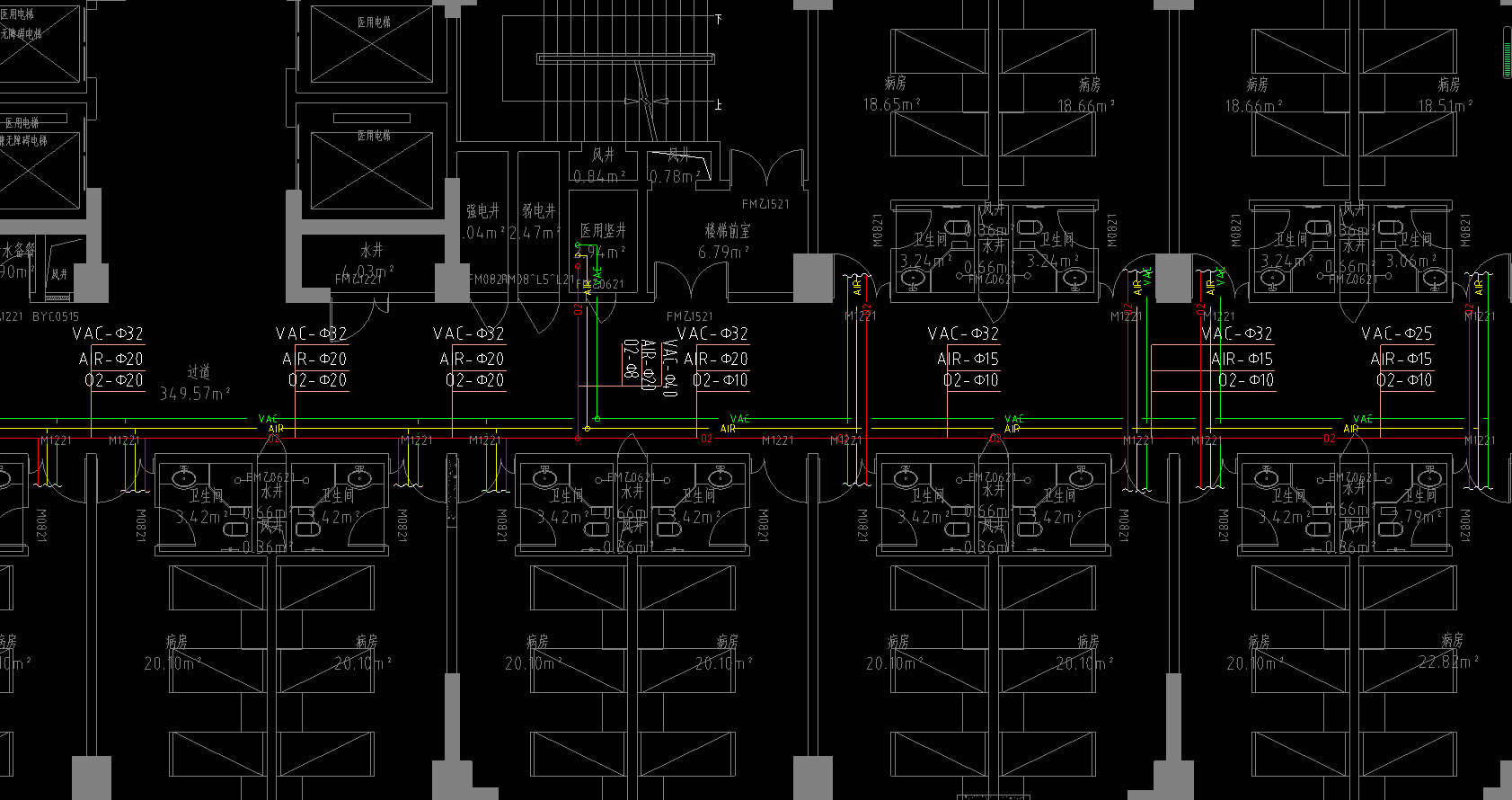华体会(中国)气体管道井、走廊中心供氧管道、负压吸引管道、压缩空气管道走向及管径规格、病房设备带大样图等。