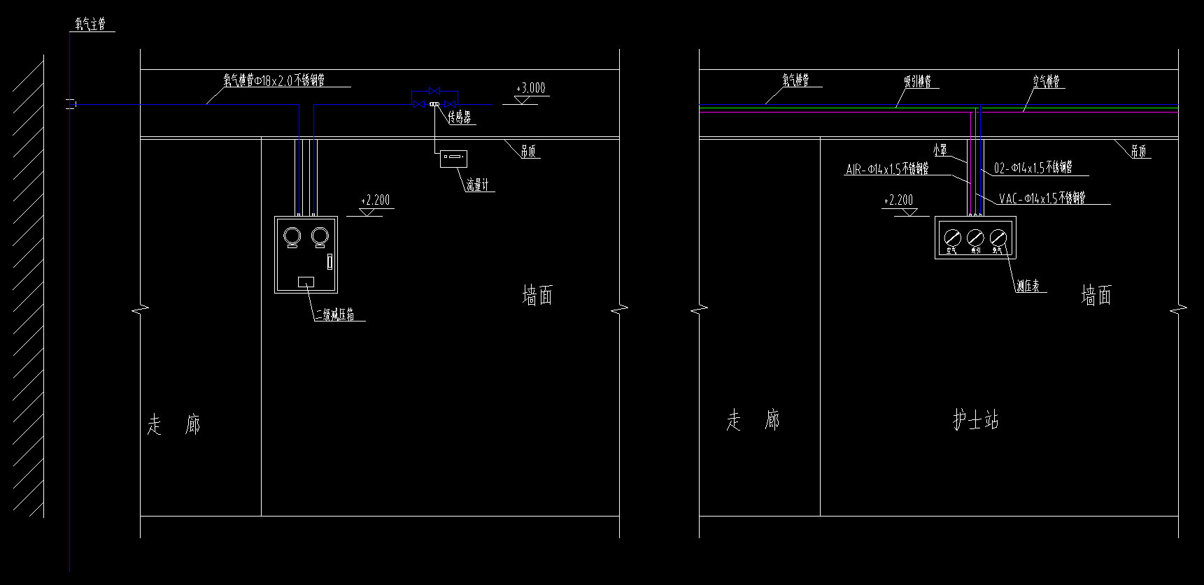 华体会(中国)气体管道氧气二级稳压箱、氧气流量计安装示意图,护士站压力观测箱压力报警器装置安装示意图。