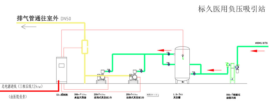 4、中心吸引站应设置应急备用电源并连接到站房配电箱,由院方负责。