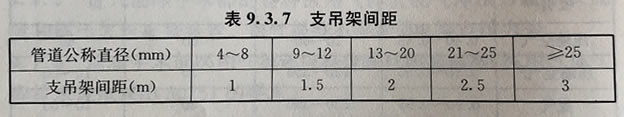 7、洁净手术部气体配管的安装支吊架间距应符合表9.3.7的规定。铜管、不锈钢管道与支吊架接触处,应作绝缘处理。