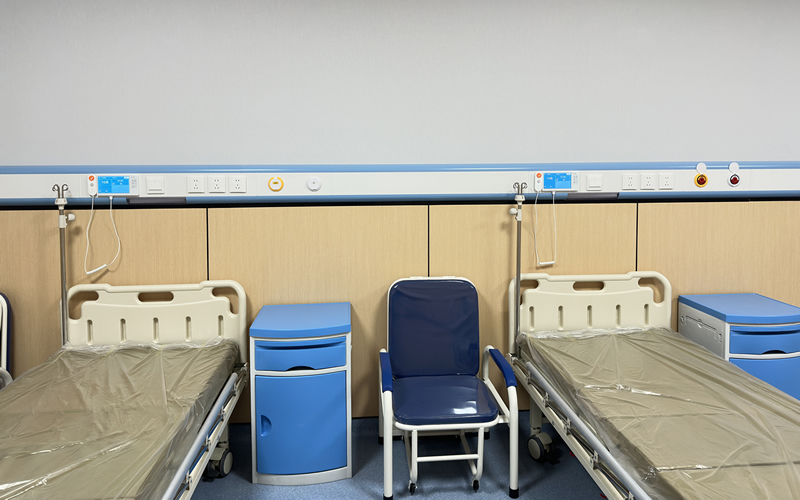 山东鲁南医院东区新安装中心供氧系统和负压吸引系统,在一层设有独立的中心供氧站和负压吸引泵组,病房每个床位设立液晶显示信息化呼叫器、阅读灯、电源插座、吸引和氧气德标DIN终端接口。