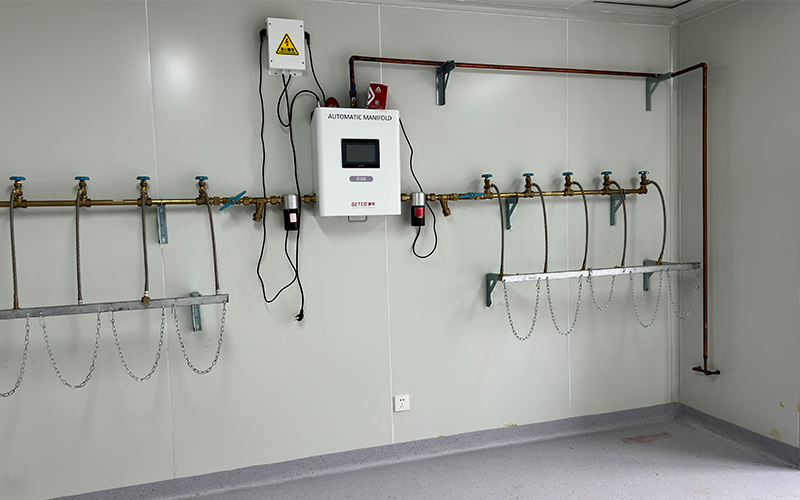 3、供氧系统氧气汇流排系统设置了氧气欠压声光报警装置,且可实现供氧的自动或手动切换。氧气瓶内的压力低,而且控制装置的操作简单易学,方便操作,可以随时调节所需要的压力。可不间断的持续的进行供氧。