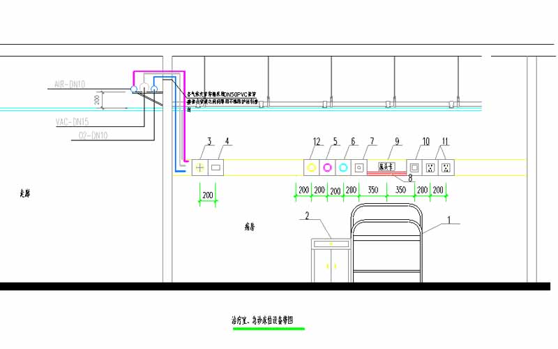 终端设备的设计要与医疗设备带协调配合,标高标注要精确到±0.01米,快速插拔接头的类型也要明确标注。