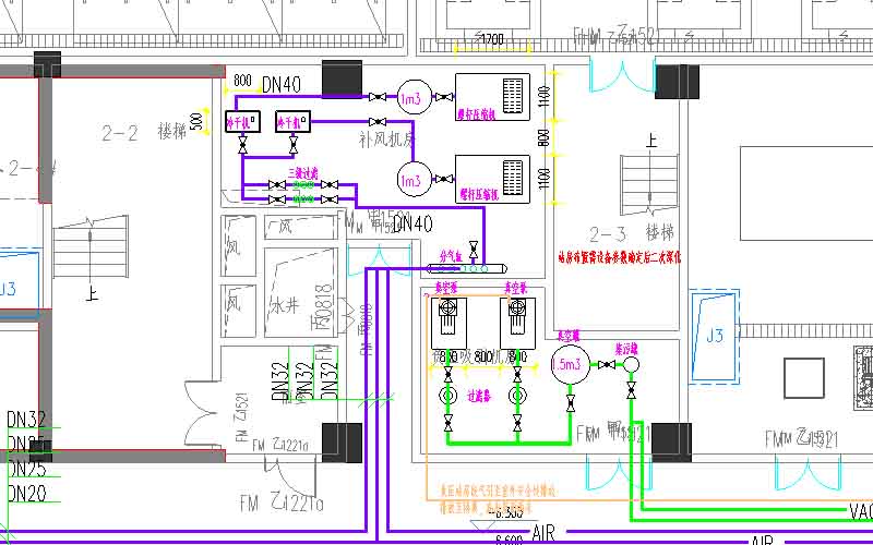 气源部分的设计要特别注意:氧气站房需要明确标注汇流排、汽化器、减压装置等关键设备的位置;真空泵房则要详细标注设备基础尺寸和排气管道走向;备用系统的切换装置也必须清晰标示。