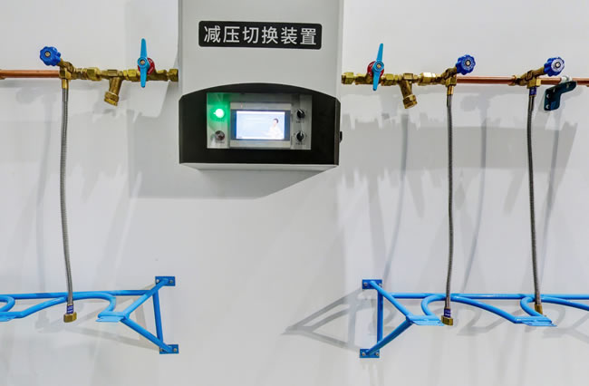 这种汇流排使用主供气瓶备用气瓶组双气源的结构,能在主供气瓶备用气瓶组减压器压力设定等方面有明显差别,当主供气瓶组的压力降为设定压力后,系统可以自动切换,让备用气瓶组开始供气,这样就能够实现不间断供气的功能,为实现下一次自动切换,在空瓶进行调换后,必须对两个气瓶组的气体减压器重新进行设定,这种形式的汇流排能通过主管线的减压器二级减压实现输出压力稳定。